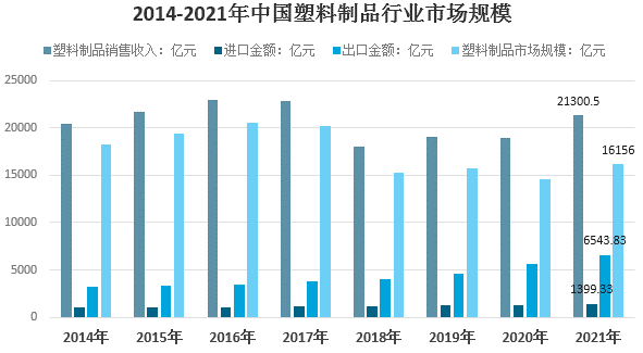 受益于上游原材料價格上漲,國內塑料制品市場止跌回暖。2021年我國塑料制品生產企業營業收入約21300.5億元,營業收入同比增長12.76%。2021年我國塑料制品行業市場規模約16156億元,市場同比增長10.7%。