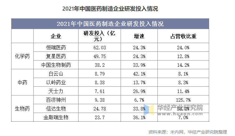 隨著藥品審評審批制度改革、國家醫保常態化調整等政策改革,“創新”逐漸成為藥企的發展理念。化學制藥行業正在發生結構性變化,隨著仿制藥出現藥品價格持續下降的同時,行業集中度也有望提升;中醫藥行業政策利好不斷,相關部門從市場準入、醫保支付、審評審批等多個維度對中醫藥行業形成政策支撐,中藥原材料價格上漲對企業決策也造成一定的影響;生物藥雖然起步晚于化學藥,但近年來卻受全球藥企熱捧,成為藥企和投資者競爭的新方向,研發投入力度較大。