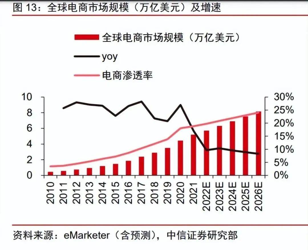歐美電商市場發(fā)展成熟,高消費力支撐穩(wěn)健基本盤。以北美市場為例,2021 年,美國電商用戶達 2.1 億,滲透率達 83.2%。盡管電商用戶的滲透已較為充分,但居民整體消費能力領先。2021年,北美地區(qū)人均 GDP 達 5.9 萬美元,是全球平均水平的 5.4 倍。同時,由于北美電商市場起步較早,物流、支付等基礎設施均已建設完善。高價值用戶及成熟的基礎設施體系有力地支撐了北美電商行業(yè)的發(fā)展,根據 eMarketer,2026 年,北美電商市場規(guī)模有望達 1.8 萬億,2022-2026 年 CAGR 約 12%,在全球電商市場占比約 22%。