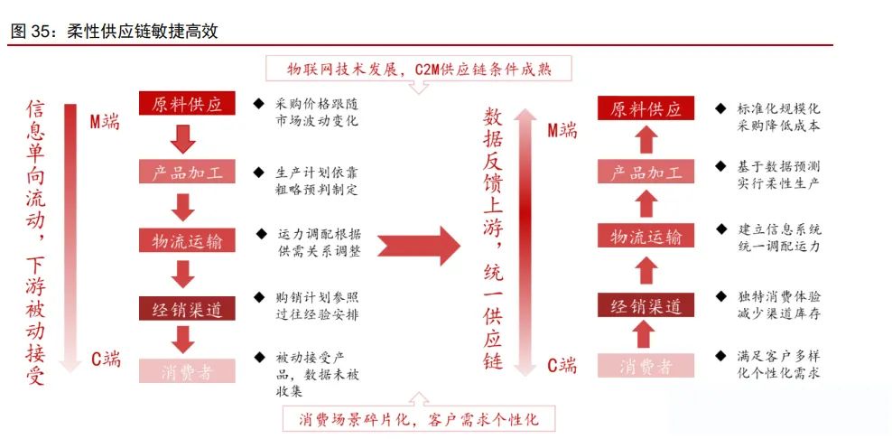 柔性供應鏈高度敏捷,更快捕捉趨勢性機會。中國供應鏈高度靈活敏捷,對傳統(tǒng)供應 鏈的數(shù)字化賦能、消費者數(shù)據的沉淀以及逆向反饋使得工廠具有按需生產的能力,大幅降 低商家?guī)齑婧统杀緣毫Γ?ldquo;小單快反”的模式也能幫助商家更快地捕捉趨勢性機會。以柔性供應鏈的極致踐行者 Shein 為例,根據 Zara 財報及晚點 LatePost,Shein 從收到訂單 到產品出廠/庫存周轉天數(shù)只需 5/30 天,生產及周轉效率明顯高于 Zara、H&M,而生產成 本僅為 Zara 的 30%-50%。