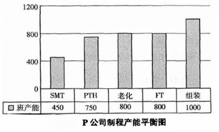 (4)其他。當設備比較昂貴時,管理及財務人員有傾向提高稼動率,生產過多的產品。下圖是P公司的一個案例,其內部各制程分別是SMT-PTH-老化-FT-組裝,其產能分布如下:
