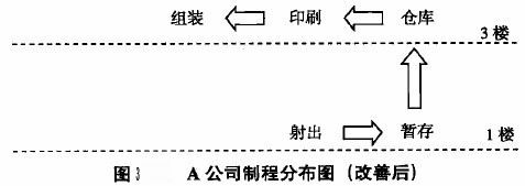 本制程為:1樓的射出完成后,由于后面的印刷效率遠遠大于輸出,所以射出后產品只能先入庫,經過印刷后,要先在1樓暫存,等當班結束時再入3樓的倉庫,后一個制程-組裝需要時來3樓的倉庫領取。這個流程中有入存2次,WIP I次,勢必造成制造過早的浪費。