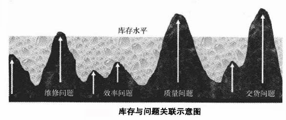 在上圖中,水面代表庫存水平,礁石代表問題點,當水面高時礁石在水底,也就是說庫存高時,問題都被掩蓋。只有當水面低時,礁石才會露出水面,也就是問題點才暴露,這就是庫存對于暴露問題的重要意義。
