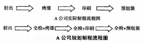 2)由于規劃不經濟不理想,造成制程路程不流線化,無法實現產品流動,而存在遷回、曲折、往復、停滯現象,使得生產不得已提前或有WIP,這也是造成制造過多過早的重要原因。如圖2所示,A公司制程有射出、印刷、組裝等,其制程分布如下: