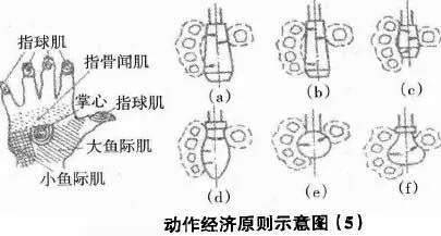 圖下(a)、(b)、(e)三種手柄設計的形式較好;(d)、(e)、(f)三種形式與掌心貼合面大,只適合作為瞬間和受力不大的操縱手柄。