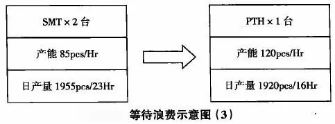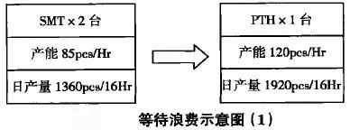 PTH日產量1920pce/16Hr,SMT日產量1360pce/16Hr,這樣安排的話,PTH制程上班的16個小時中有4.6個小時人和機處于等待狀態。