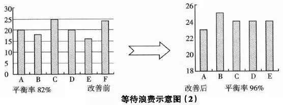 改善前有A-F共6個工站(制程),生產線不平衡,平衡率只有82%,等待較多。而改善后減少了一個工站,只有A一E共5個工站(制程),同時平衡率96%,減少了很多等待。