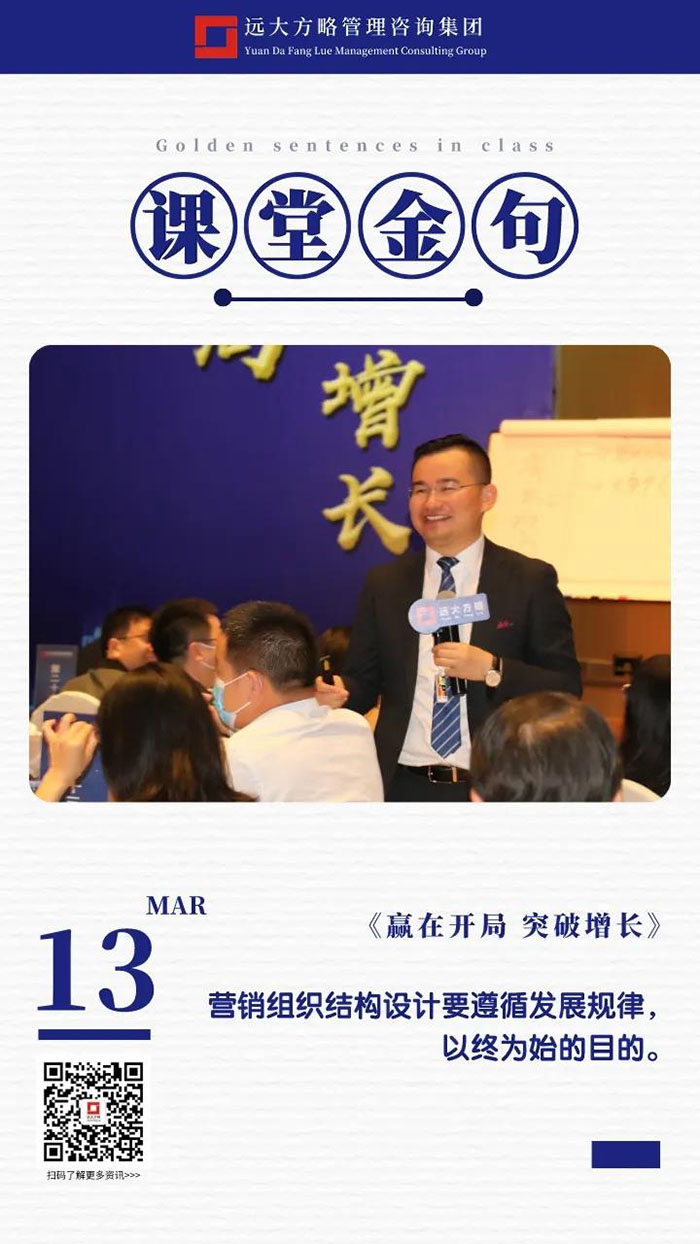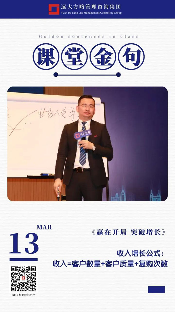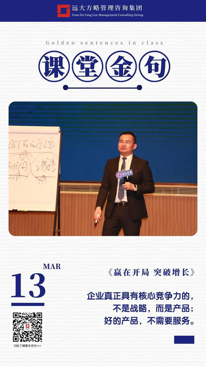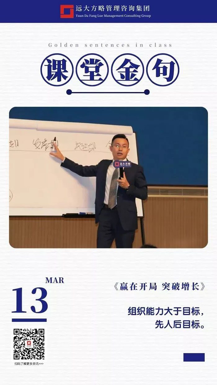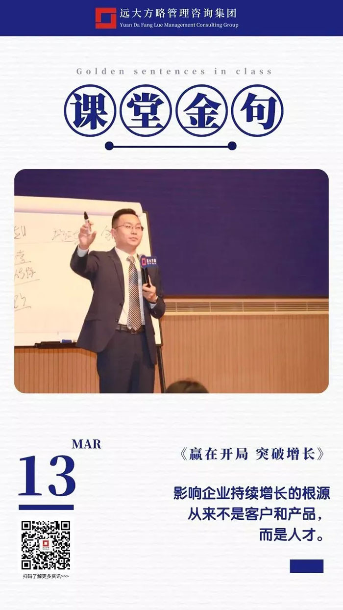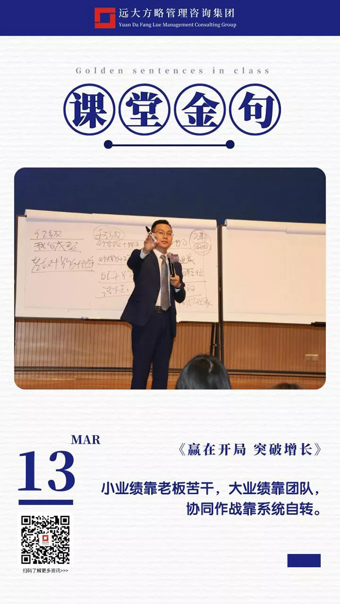 課上老師采用“道、法、術、器”相結合的形式給學員們帶來了一場精彩的知識盛宴。3月13日的課堂上兩位老師也總結了很多金句,可以很好的運用到企業(yè)的經營管理中。為了幫助大家更好的吸收和鞏固兩天的學習,小編整理了今天課程雷老師的部分金句分享給大家,希望能給大家?guī)砀鄦l(fā)。