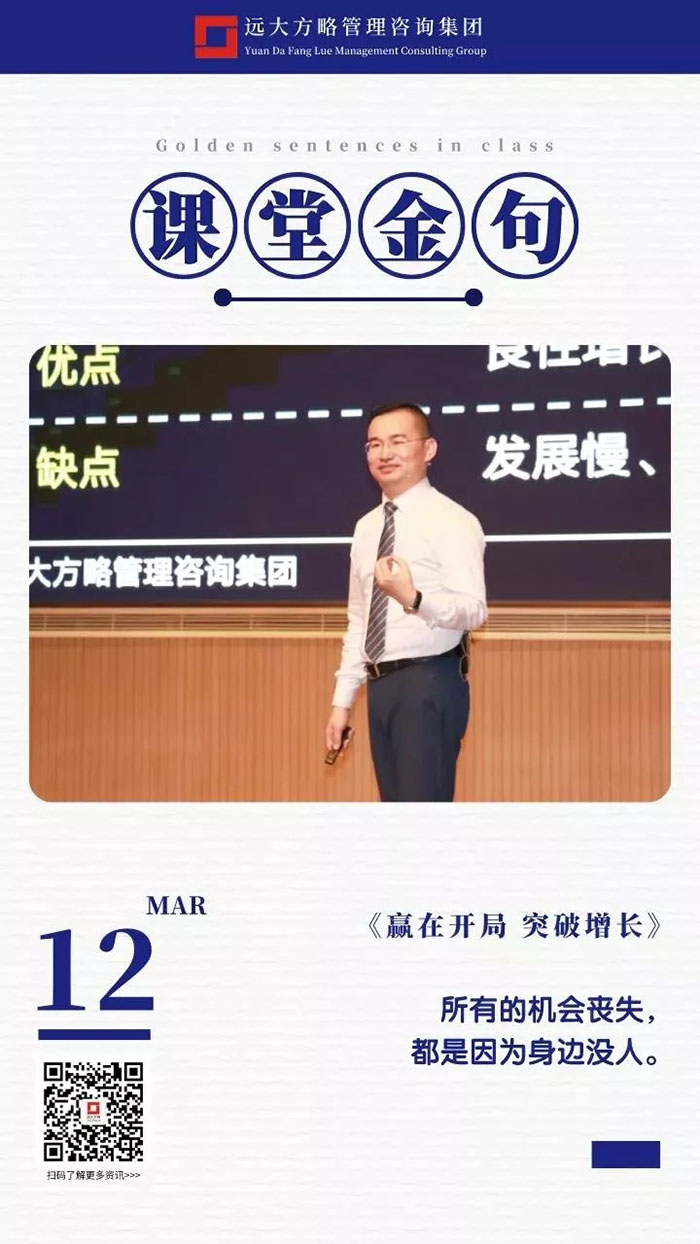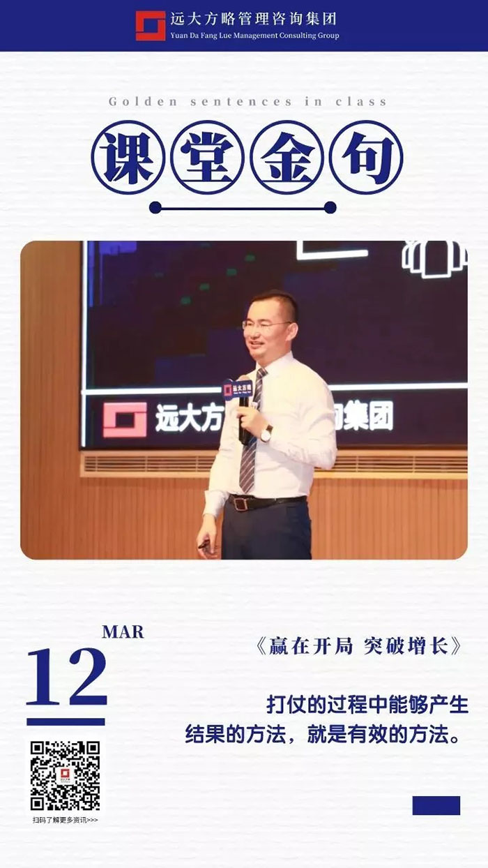 課堂上雷老師講課循序漸進,通過問題的形式逐步引發學員的思考,讓每位學員都能有所感有所悟,回到企業之后能夠落到實處,做到真正的幫企業解決問題,這也正是遠大方略的定位,成為中國實體企業實效的持續增長方案解決商,遠大方略也一直秉承初心努力踐行!