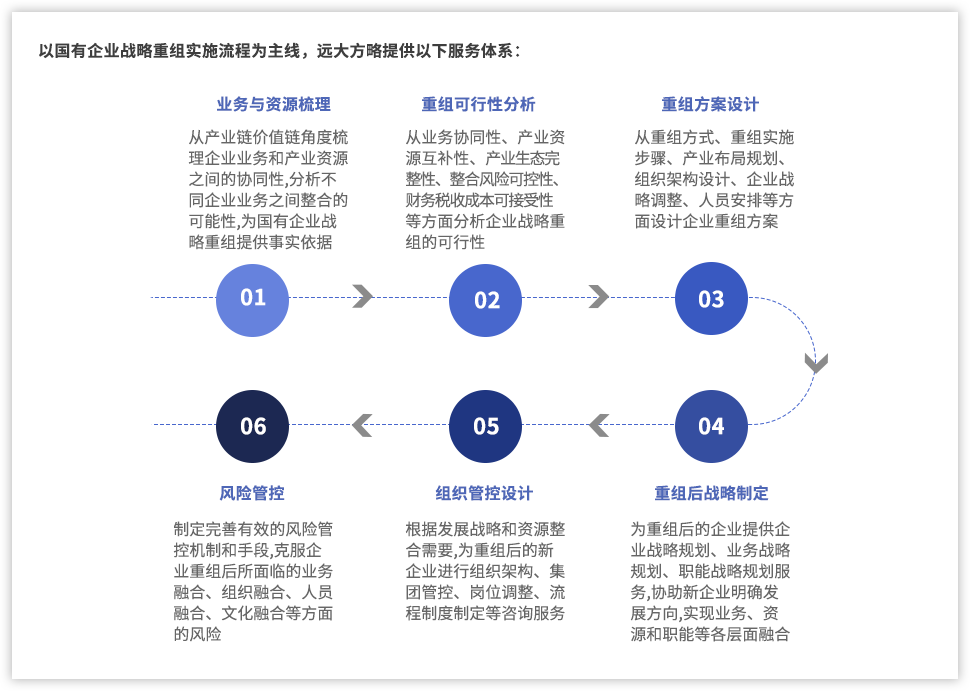 以國有企業(yè)戰(zhàn)略重組實(shí)施流程為主線,遠(yuǎn)大方略提供以下服務(wù)體系: