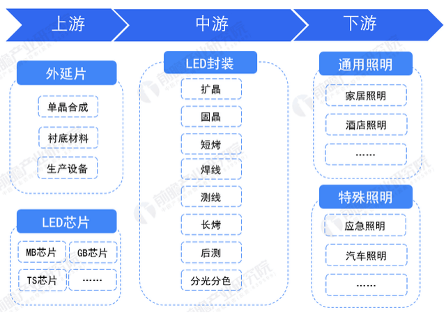 LED照明行業由上游的外延片及LED芯片廠商、中游的LED封裝以及下游照明應用領域組成。上游的外延片及LED芯片 ,主要提供LED封裝環節的原材料;中游LED封裝主要是通過擴晶、固晶、短烤、焊線等一系列流程完成LED產品的制造;下游應用則分為通用照明及特殊照明兩大類,通用照明包括家居照明、酒店照明等;特殊照明則包括應急照明、汽車照明等。