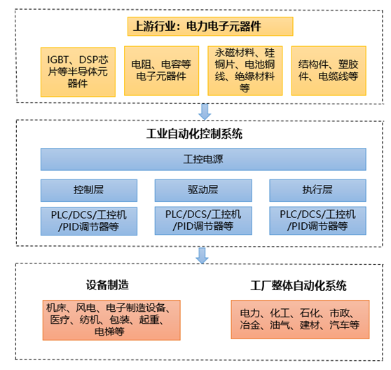 工控電源產(chǎn)業(yè)鏈主要包括原材料供應(yīng)商、工業(yè)自動(dòng)化控制系統(tǒng)供應(yīng)商、OEM型行業(yè)客戶和項(xiàng)目型行業(yè)客戶。其中,產(chǎn)業(yè)鏈上游是原材料供應(yīng)商,主要提供半導(dǎo)體元器件、電子元器件、永磁材料、硅鋼片、電磁銅線、絕緣材料、結(jié)構(gòu)件、塑膠件、電纜線等;產(chǎn)業(yè)鏈中游為工業(yè)自動(dòng)化控制系統(tǒng)供應(yīng)商,負(fù)責(zé)將工控電源、控制層、驅(qū)動(dòng)層、執(zhí)行層部件集成為工業(yè)自動(dòng)化控制系統(tǒng);產(chǎn)業(yè)鏈的下游行業(yè)分為設(shè)備制造市場(chǎng)和工廠整體自動(dòng)化系統(tǒng)的設(shè)計(jì)和實(shí)施市場(chǎng)。