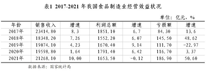 2021年,全國食品制造業銷售收入為21268.10億元,同比增長10.00%;行業利潤總額為1653.50億元,同比下降0.12%;行業虧損總額為186.90億元,同比增長50.60 %。