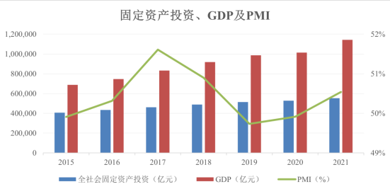 在供需改善的背景下,國內制造業景氣度自 2015 年底起觸底回升。同時中國工業企業設備能力利用水平、固定資產投資情況自 2016 年開始穩步增長,制 造業景氣度繼續上行。2020 年受新冠疫情影響,GDP 增速大幅下降,PMI 小幅提高。2021 年在疫情防控常態化下,內需穩步恢復、外貿快速增長,GDP 增速重回高位,PMI 上升至榮枯分水線之上,顯示出經濟擴張的訊號。