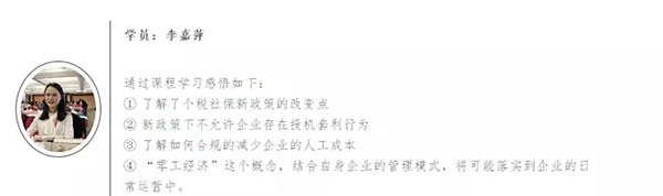 通過鄧雨薇老師的授課講解,學員們掌握了社保稅收的新政策對比變化,政策與法律對企業及個人的影響,讓學員回到企業設計出有效的落地方案。