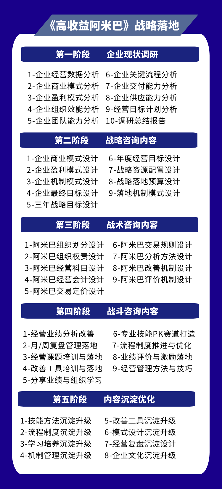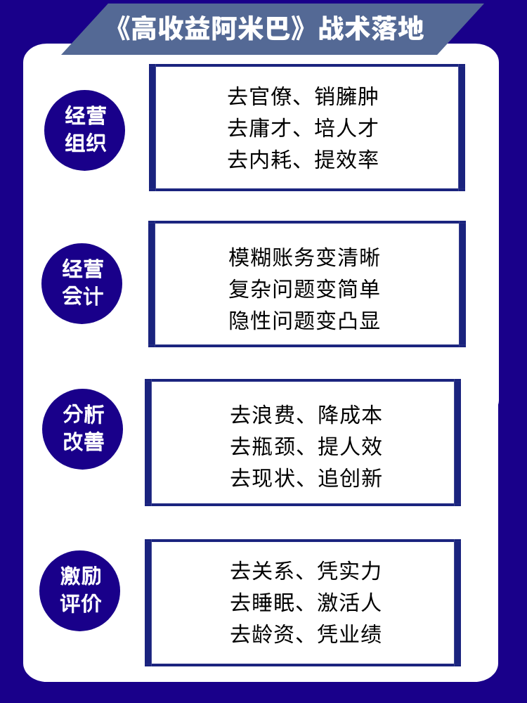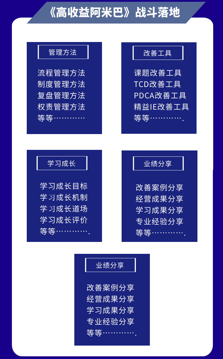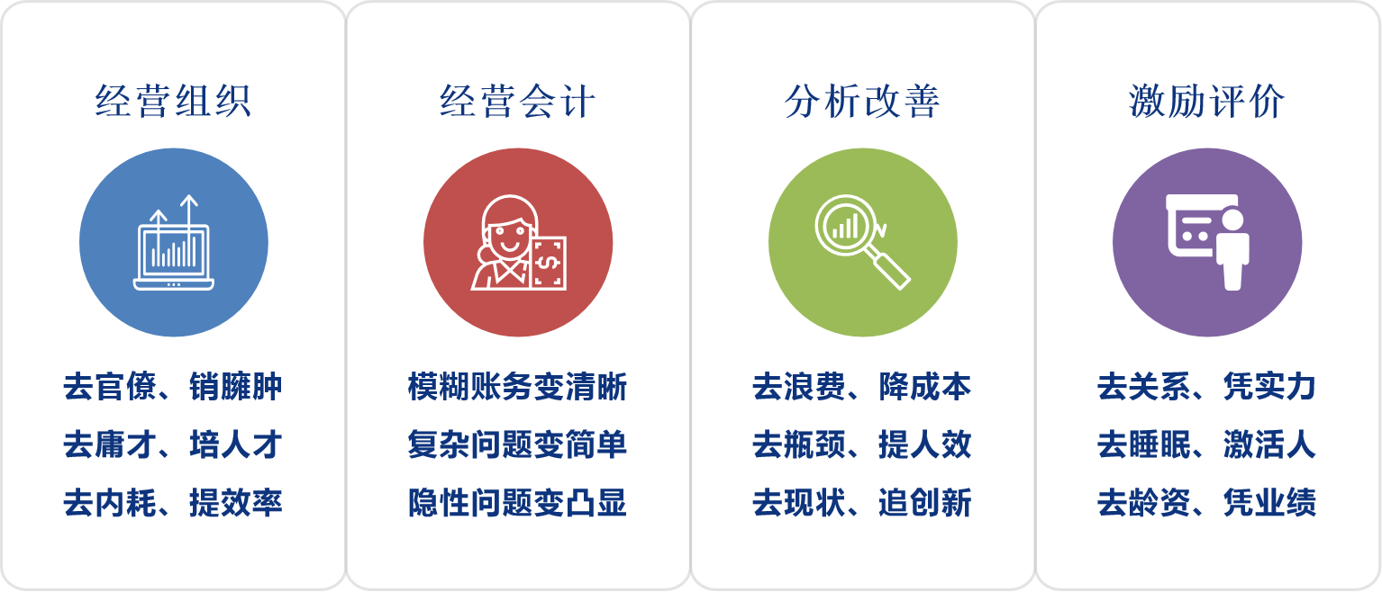 4、數據增長:(1) 公司高層、中層、基本價值觀高度統一;(2)公司企業文化清晰明確,提倡什么、禁止什么清楚明了;(3)組織架構調整實施,責、權、利下放至各事業部;(4)事業部實現獨立財務核算;(5)事業部內各阿米巴實現獨立財務核算;(6) 人才培養機制初步形成;(7) 持續降低成本的自主運營機制初步建立;(8)公司利潤率提升5%,凈利潤提升80%。