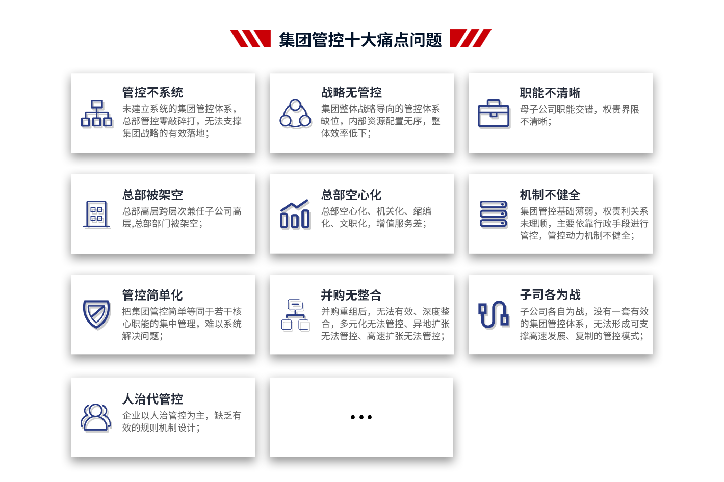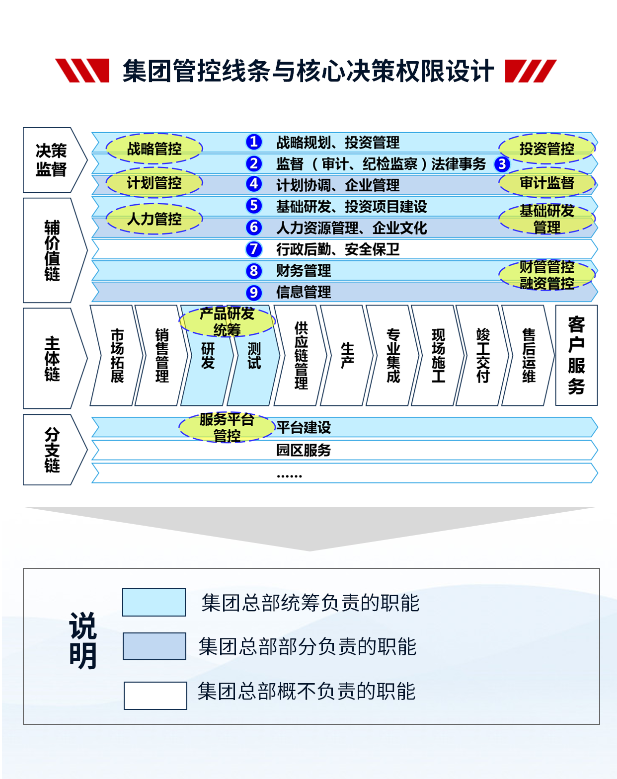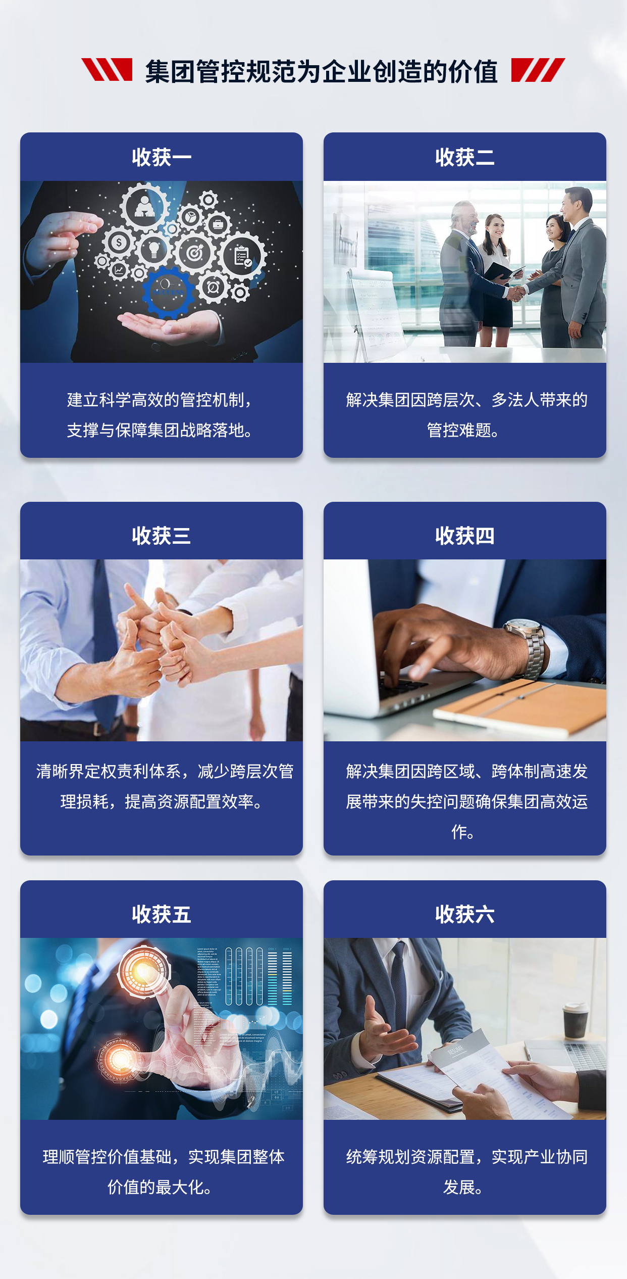 4、項(xiàng)目成果:支撐集團(tuán)戰(zhàn)略落地,提高集團(tuán)整體的運(yùn)營效率;減少因跨層次管理帶來的損耗,提高集團(tuán)內(nèi)部資源配置效率;建立一套廣譜、可復(fù)制的管控模式;解決集團(tuán)因跨區(qū)域、跨體制、高速發(fā)展帶來的失控問題,確保集團(tuán)高效運(yùn)作;理順管控價(jià)值基礎(chǔ),實(shí)現(xiàn)集團(tuán)整體價(jià)值的最大化;打造強(qiáng)勢總部,解決集團(tuán)總部空心化、文職化等問題。