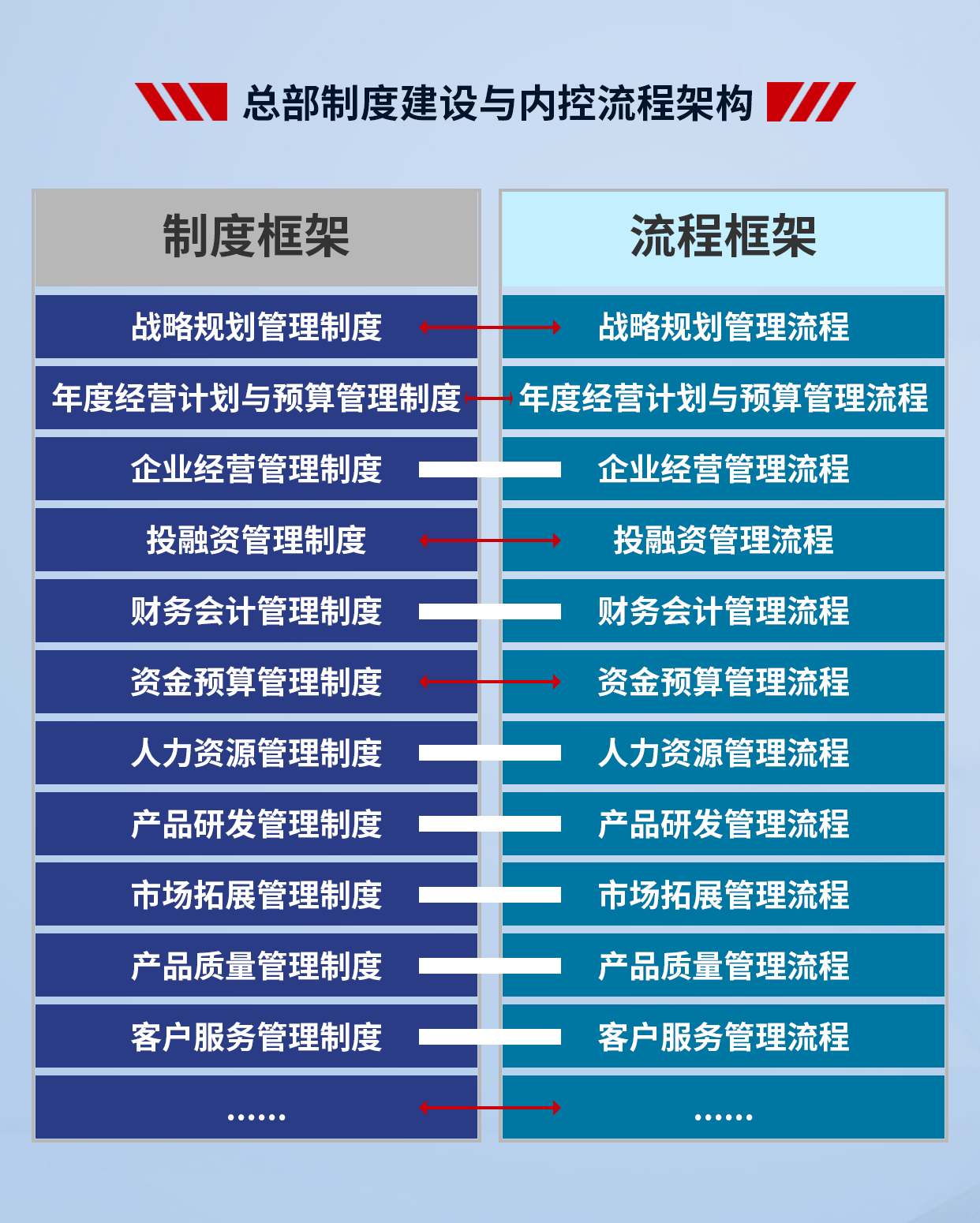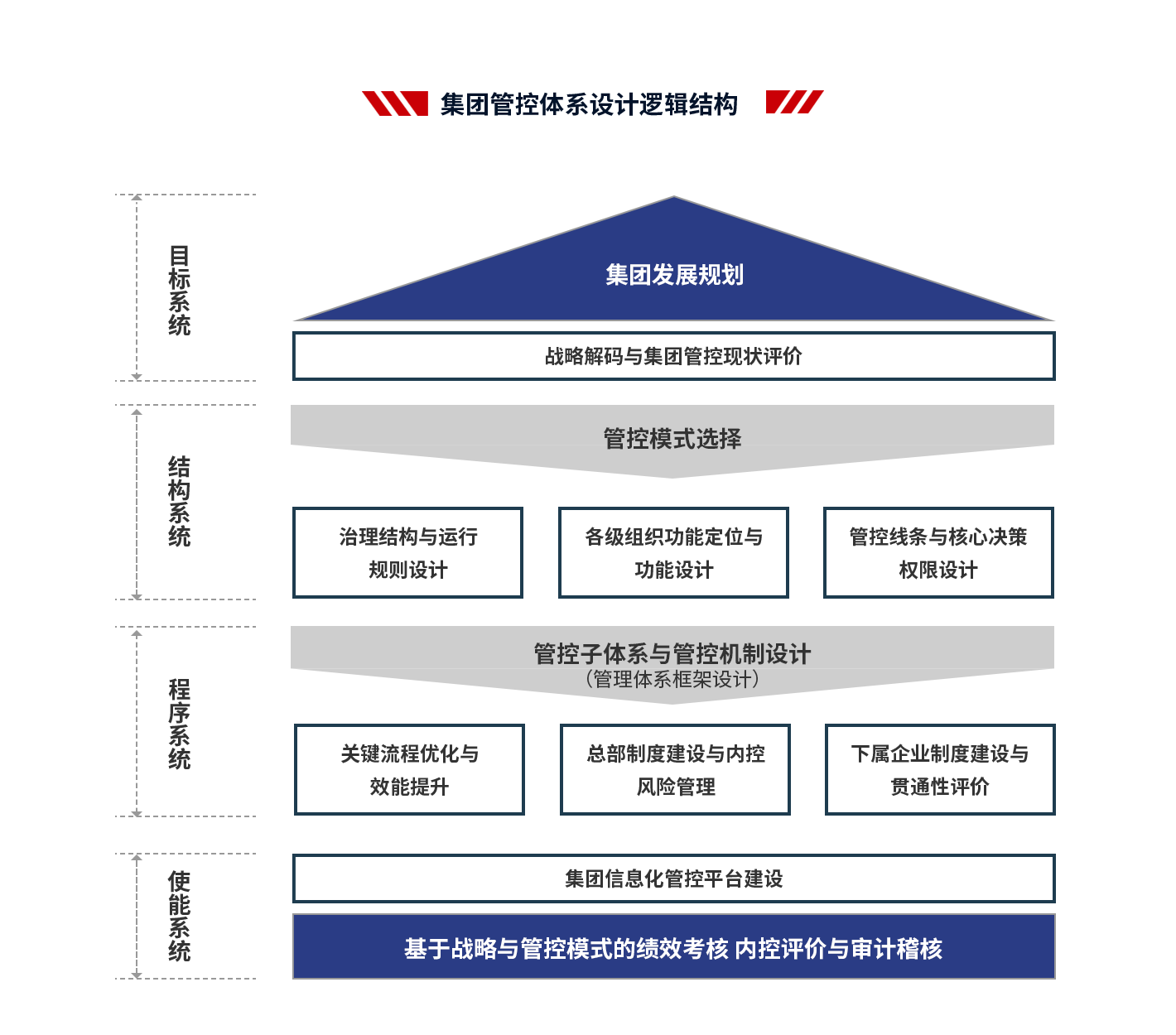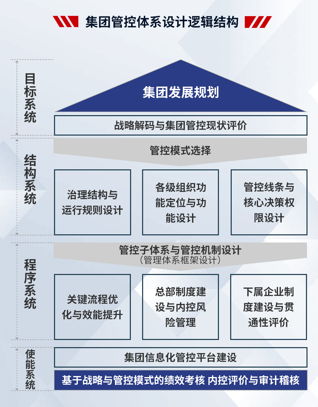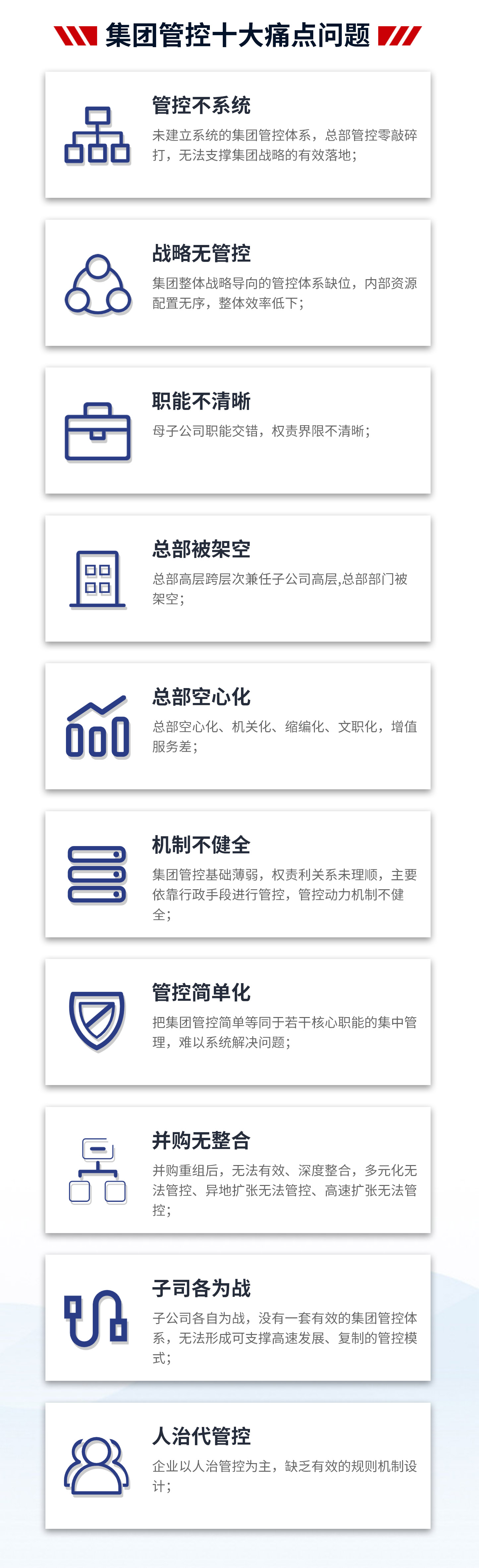 4、項(xiàng)目成果:支撐集團(tuán)戰(zhàn)略落地,提高集團(tuán)整體的運(yùn)營效率;減少因跨層次管理帶來的損耗,提高集團(tuán)內(nèi)部資源配置效率;建立一套廣譜、可復(fù)制的管控模式;解決集團(tuán)因跨區(qū)域、跨體制、高速發(fā)展帶來的失控問題,確保集團(tuán)高效運(yùn)作;理順管控價(jià)值基礎(chǔ),實(shí)現(xiàn)集團(tuán)整體價(jià)值的最大化;打造強(qiáng)勢總部,解決集團(tuán)總部空心化、文職化等問題。